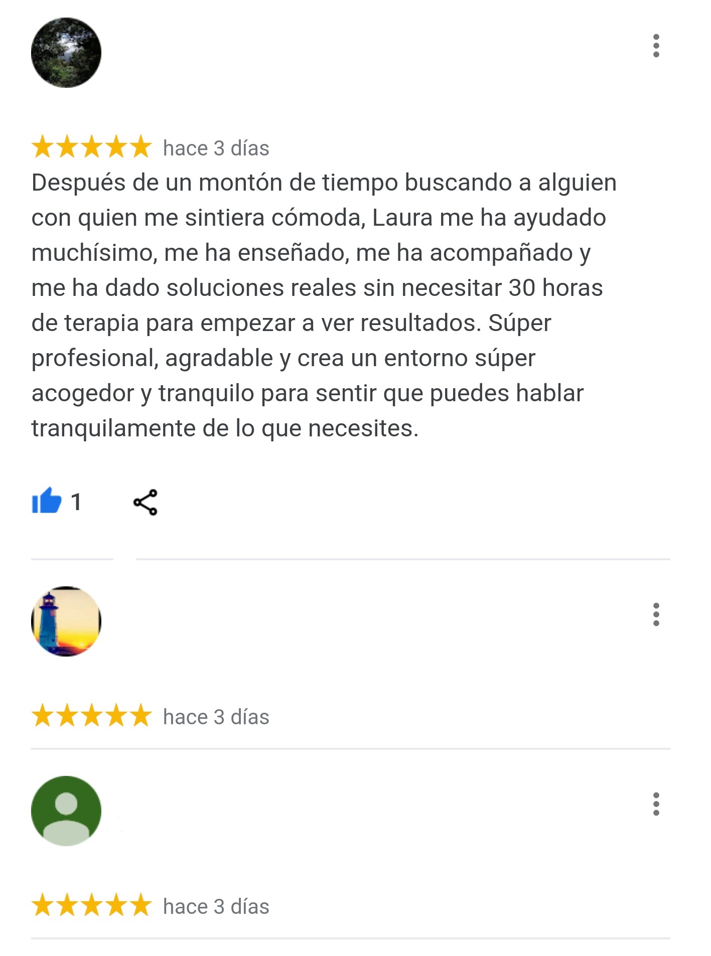 Como ves, son opiniones reales de personas que han hecho terapia psicológica cognitivo conductual en nuestro centro y hemos ayudado a solucionar sus problemas y sentirse mejor.