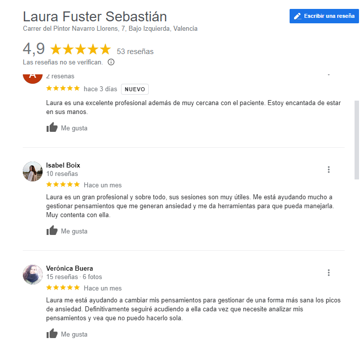 En nuestra ficha de google de Laura Fuster psicóloga en Valencia y online puedes ver reseñas de pacientes reales que han hecho terapia en nuestra consulta de psicología de Valencia. También hay algunas opiniones de personas que han trabajado con nosotras en la modalidad online.
